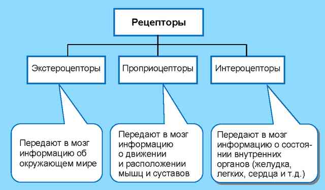 Все рецепторы, которые есть в нашем организме, делятся на три группы (к сожалению, они получили варварские и труднопроизносимые названия):