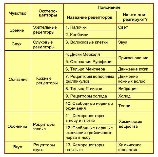 Слово «экстероцептор» буквально означает внешний приемник (экстер — внешний, рецептор — приемник). Пять чувств, о которых знали еще древние, связаны с познанием внешнего мира и, следовательно, с экстероцепторами. Однако современная картина, как видно из таблицы, вносит много интересных подробностей. Графа «Название рецепторов» сообщает, что наши родимые органы чувств используют 13 типов внешних рецепторов.