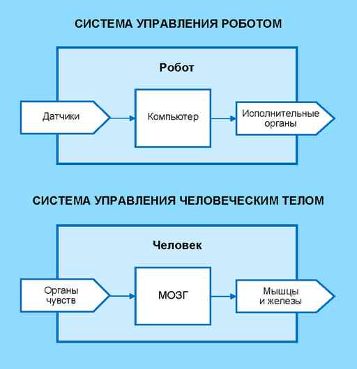 Попробуем устранить недостатки. Добавим органы чувств, органы движения и еще кое-что — компьютер превратится в робота. Это меняет дело, так как робот немножко похож на живого мужика или женщину. Сходство увеличится, если сделать органы чувств более изощренными, органы движения — более гибкими, а компьютер — более интеллектуальным. Аналогия между роботом и человеком является весьма глубокой. Чем же она хороша? Робот — самодвижущийся автомат, которым управляет автоматическая система управления. Эта система содержит три основных элемента:
